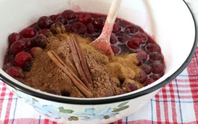 Es ist erforderlich, 1 kg entkernte Kirschen zu nehmen, mit Zucker zu bedecken und mehrere Stunden ruhen zu lassen. Wenn die Beeren ihren Saft abgeben, fügen Sie Kakao und Zimt hinzu, stellen Sie einen Topf bei mittlerer Hitze auf und bringen Sie die Mischung zum Kochen. Schalten Sie die Marmelade aus, kühlen Sie sie ab und kochen Sie sie erneut. Der Schaum muss entfernt werden und es muss auch darauf geachtet werden, dass die Masse nicht verbrennt.