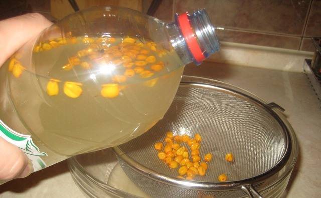 Nach dem Pressen aus dem Kuchen mit Samen wird ein heilendes Sanddornöl hergestellt. Beeren enthalten viel natürliches Fett: im Fruchtfleisch - 9%, in den Samen - 12%. Wenn das Öl hineingegossen wird, steigt es nach oben und verleiht dem Getränk einen bestimmten Geschmack. Zur Transparenz wird das Produkt durch Mull- und Baumwollfilter gefiltert. Um das Öl zu entfernen, wird die Tinktur in den Kühlschrank gestellt. Wenn das Fett steigt, kann es leicht mit einem Löffel oder einer Spritze entfernt werden. Die Heilungsfraktion wird in einen anderen Vorratsbehälter gegeben.