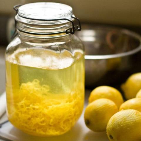 - Um die Bitterkeit der Schale zu beseitigen, wird die Zitrone mit kochendem Wasser übergossen und in große Ringe geschnitten. Die weiße Schicht unter der Schale nimmt Fuselöle auf.