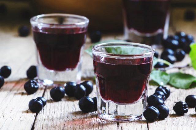 Sie können den Geschmack von hausgemachtem Alkohol nicht nur mit Gewürzen bereichern. Schwarze Apfelbeere mit Kirschblättern und Wodka erhält ein ungewöhnliches Aroma. Die satte tintenrote Farbe des Likörs und seine charakteristische Adstringenz passen gut zum Geschmack von Sommerbeeren.