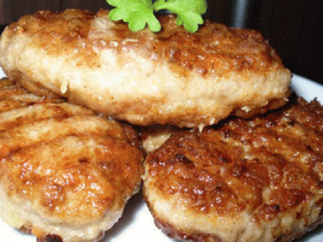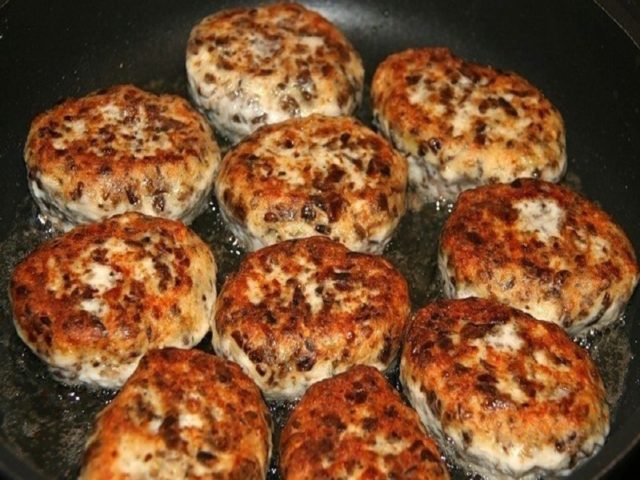 - Danach abkühlen lassen, mit einem Mixer schlagen, Mehl, Sauerrahm, Salz, Pfeffer geben und das Hackfleisch in Form von Schnitzel in einer Pfanne mit einem Löffel formen (die Konsistenz von go stellt sich als ziemlich flüssig heraus).