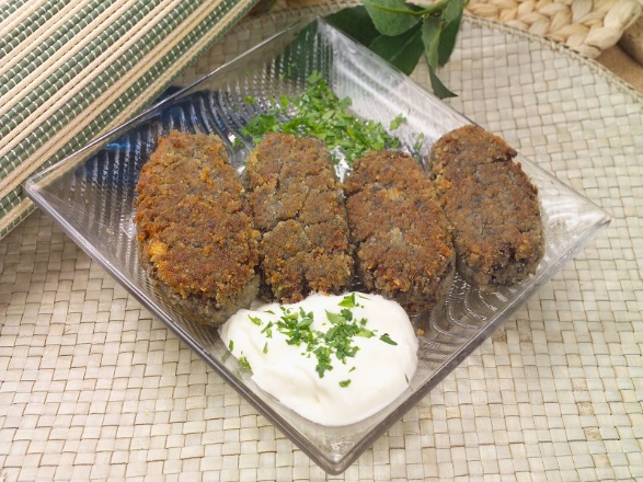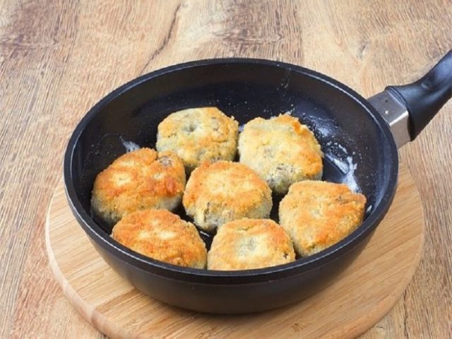 - Aus der Pilzmasse Schnitzel formen, in Mehl, geschlagenen Eiern und Semmelbröseln rollen, in einer Pfanne in erhitztes Öl geben und auf beiden Seiten braten.