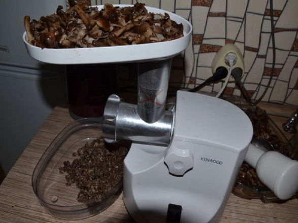 - 1 kg Pilze kochen, mit einem Fleischwolf oder Mixer mahlen.