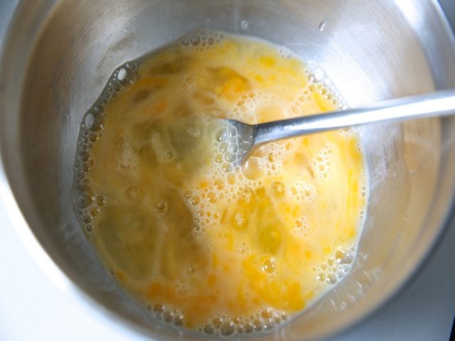 - Sobald die Mischung vollständig abgekühlt ist, 1 Ei zerbrechen, umrühren, bei Bedarf Salz und Pfeffer hinzufügen.