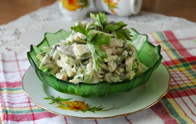 Gesalzene Pilze lassen sich nicht nur gut mit Fleisch, sondern auch mit Gemüse kombinieren. Ein gutes Beispiel ist dieser Salat mit einer originellen Zusammensetzung.