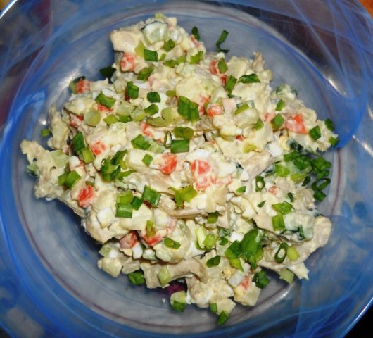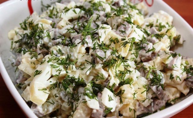 - Dann das Fleisch fein hacken, die Stücke in eine Salatschüssel geben und mit Mayonnaise bestreichen. Fügen Sie in Zukunft jeder Schicht der Zutaten ein Dressing hinzu.