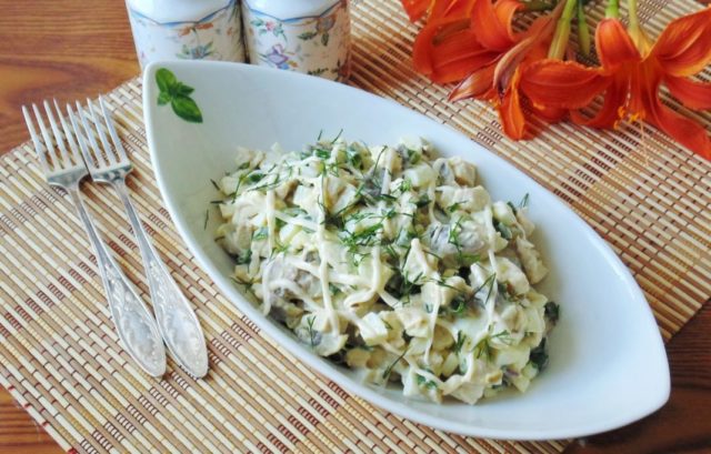 Salat mit gesalzenen Milchpilzen und Hühnchen