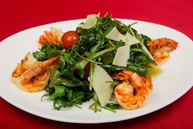 Ein weiteres Salatrezept mit einer originellen Geschmackskombination aus Milchpilzen, Rucola und Garnelen.