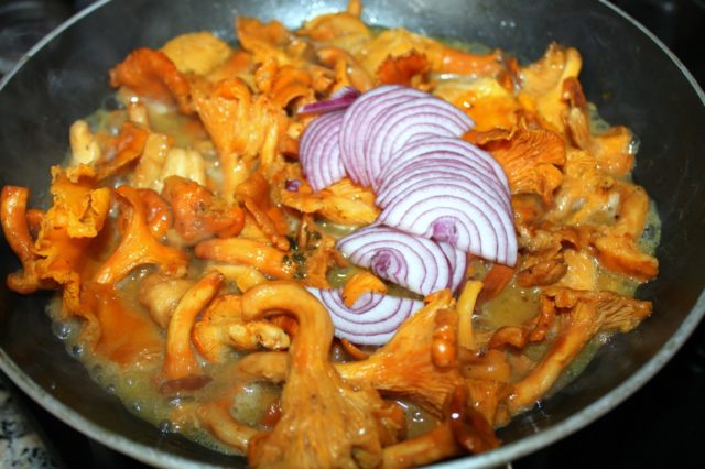 - 1 mittelgroße Zwiebel fein hacken und in Pflanzenöl anbraten. Wenn die Zwiebel durchscheinend wird, fügen Sie die verarbeiteten Pfifferlinge hinzu.