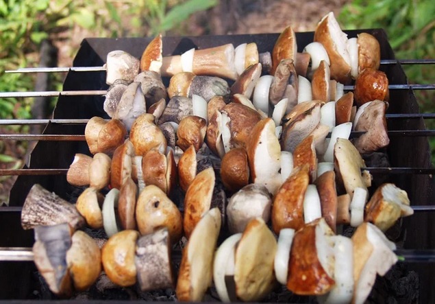 Vor dem Braten werden Steinpilze normalerweise mit Pflanzenöl, Mayonnaise oder Sauerrahm mit Gewürzen und Salz überzogen, einige Stunden aufbewahrt und dann über schwelenden Kohlen gebraten. Die Garzeit beträgt 15-20 Minuten, alles hängt davon ab, wie stark die Hitze ist. Der Kebab muss ständig in verschiedene Richtungen zum Feuer gedreht werden. Sobald es golden wird, ist das Gericht fertig.
