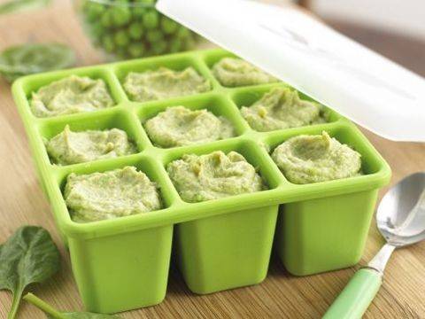 - Die abgekühlte Masse wird in Eiswürfelschalen oder kleinen Behältern eingefroren. Einzelportionen hängen vom Alter des Kindes ab. Wir stellen sie in den Kühlschrank.