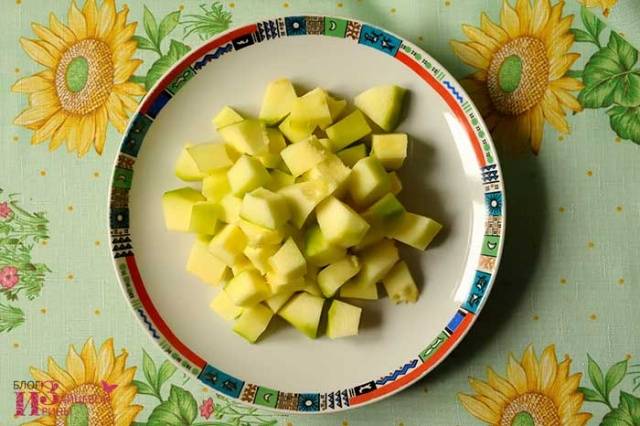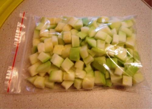 - Das vorbereitete und getrocknete Gemüse in Streifen schneiden. Dann bereiten wir kleine Würfel vor. Sie sollten nicht mehr als 2 cm betragen, dann wird das Gefrieren intensiver, was bedeutet, dass die vorteilhaften Eigenschaften besser erhalten bleiben. Die Mitte der Zucchini mit der Samenkammer kann belassen oder mit einem Löffel entfernt werden.