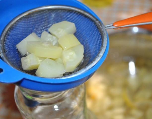 - Wir legen das Gemüse in ein Sieb, damit das flüssige Glas.