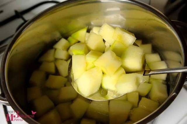 - Das Gemüse in Stücke schneiden und nicht länger als 10 Minuten in kochendem Wasser kochen. Durch Kochen und Blanchieren werden Nitrate aus der Zucchini entfernt.