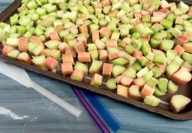- Wenn Sie Rhabarber in Behältern einfrieren möchten, müssen Sie zwischen den Pflanzenteilen und dem Deckel 1 - 1,5 cm leeren Raum lassen, da das Volumen der Produkte beim Einfrieren zunimmt.