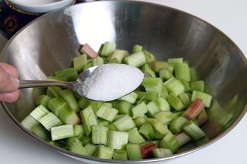 - Die Gemüsestücke werden gleichmäßig mit einer Zuckerschicht bestreut, so dass der Rhabarber vollständig bedeckt ist.
