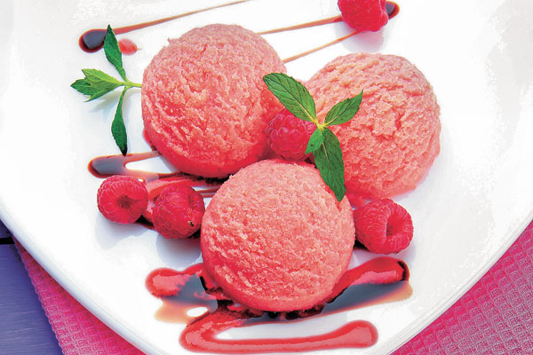 Wenn Sie Sorbet servieren, können Sie jede Portion mit ein paar gefrorenen Beeren garnieren.